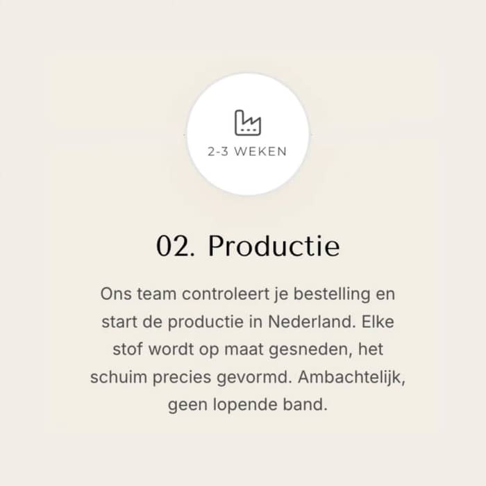 Ons team controleert je bestelling en start de productie in Nederland. Elke stof wordt op maat gesneden, het schuim precies gevormd. Ambachtelijk, geen lopende band.