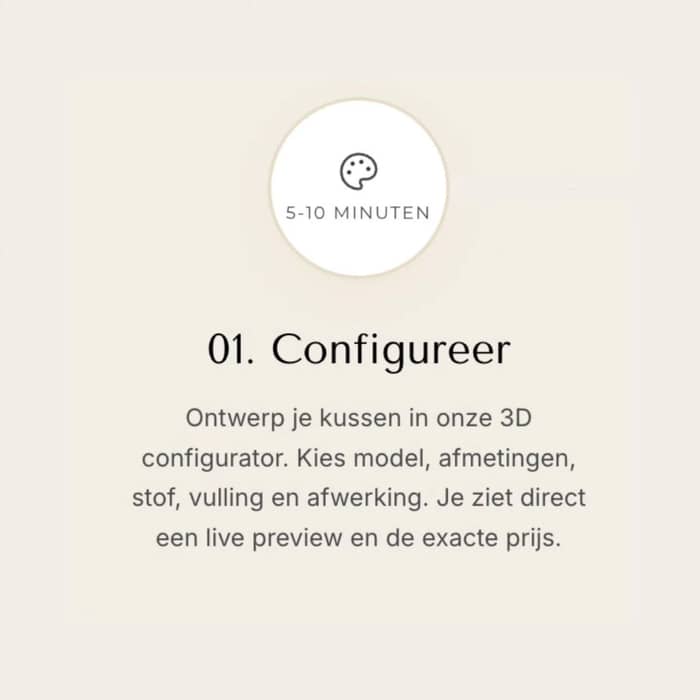Ontwerp je kussen in onze 3D configurator. Kies model, afmetingen, stof, vulling en afwerking. Je ziet direct een live preview en de exacte prijs.