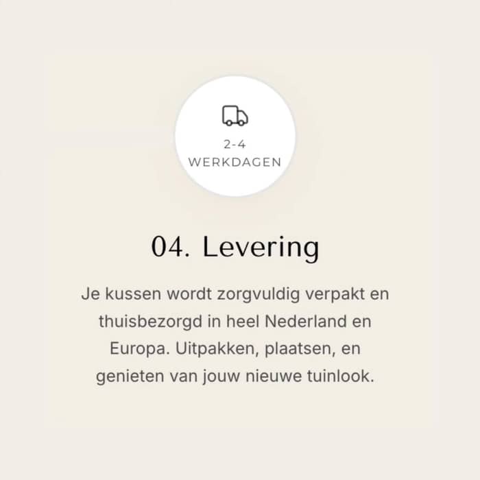 Je kussen wordt zorgvuldig verpakt en thuisbezorgd in heel Nederland en Europa. Uitpakken, plaatsen, en genieten van jouw nieuwe tuinlook.
